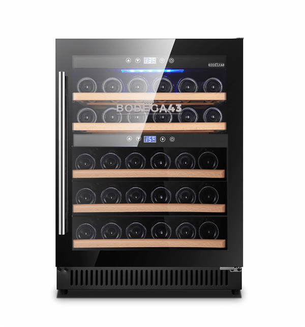 Varianten dieses Typs können beispielsweise unter der Arbeitsplatte montiert werden und fügen sich nahtlos in das Gesamtbild der Küche ein. Die Abmessungen sind standardisiert, damit die Geräte in Küchen verschiedener Marken aufgestellt werden können. Beispielsweise sind Weinkühlschränke in einer Breite von 15 bis 60 Zentimetern erhältlich. Im Gegensatz zu freistehenden Weinkühlschränke benötigen diese Varianten keinen Mindestfreiraum, da an der Vorderseite des Geräts ein spezielles Belüftungssystem installiert ist.Die Variante BODEGA43-40 ist ein Weinkühlschrank mit 2 Temperaturzonen, der sich für die Lagerung aller Arten von Wein eignet. Im Weinklimaschrank BODEGA43-40 können Sie Rot- und Weißwein problemlos nebeneinander lagern, da die ideale Lagertemperatur gleich ist. Der Weinschrank verfügt über ein blaues LED-Display und ein Touch-Bedienfeld. Der Einbau-Weinkühlschrank verfügt über Regaleinschübe mit kugelgelagerten Holzgittern.